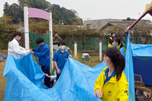 授業では、ペットHUGで学んだ内容をもとに、雨風をしのげる場所への配置や、床・壁・屋根をブルーシートで養生するなど、寒さや暑さ、雨風から動物を守る工夫を実践します。