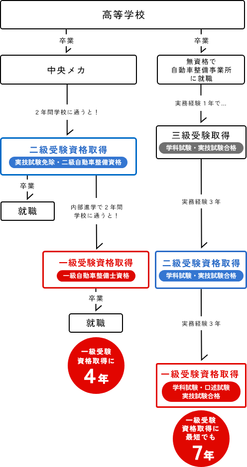 一級自動車整備科を卒業する事により、大学を卒業したことと同じ扱いに。基本給が大卒になります。