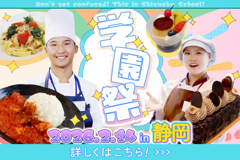 まずはここから 高校生の方へ 社会人・大学生・短大生の方へ 高校の先生方へ 留学生の方へ 資格・就職 人事採用担当者の方へ 在校生・卒業生の方へ 静岡校レストラン&パティスリーリリウム OPEN CAMPUS PICK UP 01.10 (土) 10:00 〜 14:00 オープンキャンパス 新年🎍のオープンキャンパスはお祝いテイストいっぱいの握り寿司で決まり🍣自分だけ… 詳しくはこちら TOPICS 一覧はこちら 入試情報 学科・講座 学校紹介 資格・就職 よくある質問 オーキャン 資料請求 アクセス パンフも最新情報もお家で見放題♪ \質問もできる!/ 募集要項・入試日程 AO入試試験(総合型選抜)について 就職について OPEN CAMPUS オープンキャンパス 01.10 (土) 10:00 ~ 14:00 オープンキャンパス 01.31 (土) 10:00 ~ 14:00 おすすめのイベントはこちら イベント一覧はこちらから COURSE 学科 上級調理経営学科 Advanced Culinary Management 料理人として、社会人として、通用する実力を磨く。 男女80名/2年制 取得可能資格 調理師免許/専門士/食育インストラクター/料理学校協会教員資格 など 詳しくはこちら 製菓衛生師科 Confectionery Hygiene お菓子作り、パンづくりを、とことん極める。 男女80名/2年制 取得可能資格 製菓衛生師/専門士/食品衛生責任者/料理学校協会教員資格 など 詳しくはこちら 調理師科 Cooks 1年で就職に必要な技術と資格の取得を目指します。 男女40名/1年制 取得可能資格 調理師免許/食品衛生責任者/フードアナリスト/介護職士3級 など 詳しくはこちら 講座 フード・パティシエ専科 Food And Patissier Special Course 独立開業を目指す方から、本格的な料理を学びたい方まで。 国家試験資格取得講座/夜間部 取得可能資格 製菓衛生師受験資格/食育インストラクター など 詳しくはこちら Instagram 【🍣1/10オープンキャンパスはお寿司✨】 シャリを握って、ネタをのせて… 本格的なお寿司づくりにチ ✨️学園祭予約受付開始!✨️ 今年もやってきました!鈴木学園学園祭が2/14に開催! おいしいお菓 🎅🪅メリークリスマス🪅🎅 本校でもクリスマスオーブンキャンパスを開催しました!その様子を公開🔔✨ 🍣年明け🎍お寿司オーキャン開催🍣 鈴木学園のお正月はお寿司のオープンキャンパス✨️ 本格お寿司の作 オリビエ・ローランジェ国際料理コンクールは、“海の資源を守る持続可能な料理”をテーマに、全国の学生が 夢のような1週間を終えて…2班も無事帰国しました!✈️✨ パリの街はどこを切り取っても刺激だらけ。 Instagram公式アカウントはこちら@suzugaku_shizuoka SCHOOL GUIDE 入学案内・学費 Learn More → CAREER 就職・資格 Learn More → SCHOOL LIFE 学校紹介 Learn More → SCHOOL RESTAURANT 学校レストラン Learn More → INDIVIDUAL 個別見学・個別相談会 Learn More → NEWS 2025/10/01 お知らせ 2025Eコマース 限定ネット販売開始 10/1~数量限定 2025/04/09 お知らせ 大阪・関西万博2025 静岡県ブースに鈴木学園の学生が参加しました! 2025/02/25 お知らせ 2024第17回製菓衛生師養成施設技術コンクール全国大会 2024/10/25 お知らせ 2024 松坂屋販売開催 11/13~ 2024/10/25 お知らせ 2024年 Eコマース製菓ネット限定販売 GROUP SCHOOLS 中央歯科衛生士調理製菓専門学校 専門学校中央医療健康大学校 専門学校中央メカニック自動車大学校 中央動物総合専門学校 しらゆり幼稚園